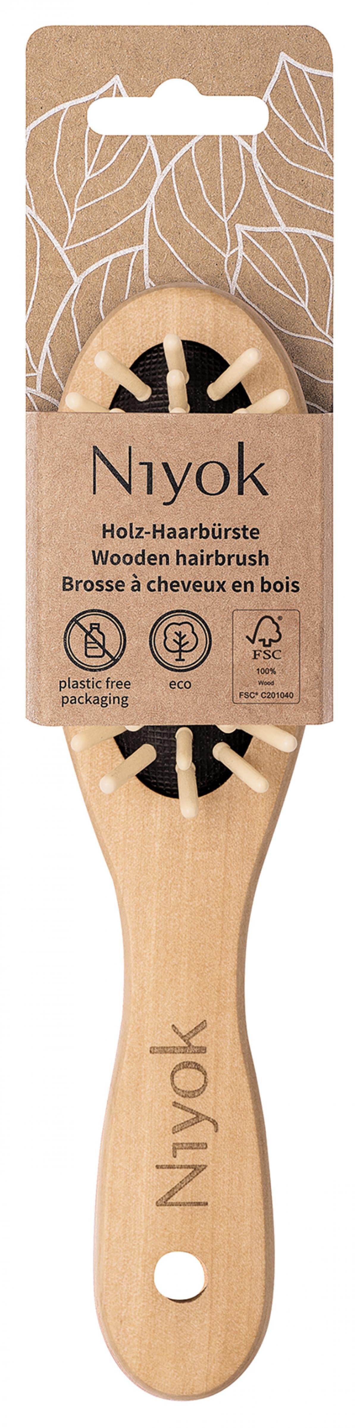 Die Niyok Holz-Haarbürste ist mit ihren Holznoppen perfekt für alle Haartypen und die tägliche Anwendung geeignet.