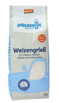Für den Weizengrieß wird bester demeter-Weizen verwendet. In der Spielberger Mühle wird das Getreide vermahlen und dabei mit größter Sorgfalt und Fingerspitzengefühl der Grieß abgesiebt. Der Weizengrieß ist ein vollwertiges Produkt, da er Teile der wertvollen Schale und des Keimlings enthält. Damit enthält er noch viele wertvolle Bestandteile des vollen Korns. Der Weizengrieß eignet sich besonders für Grießbrei. Klößchen, Aufläufe und Grießschnitten.