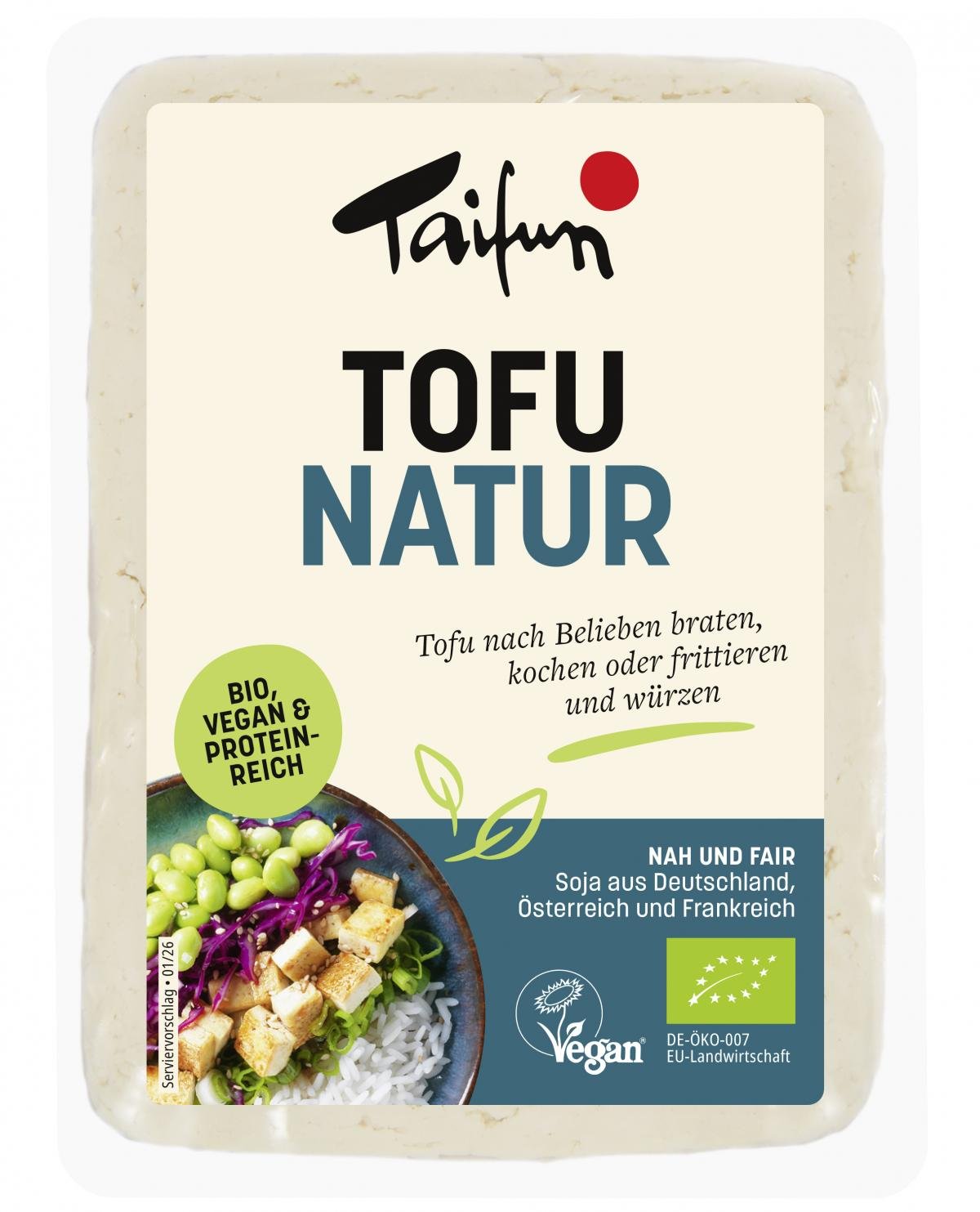 weniger anzeigenBevor Sie den Tofu verarbeiten, tupfen Sie ihn mit einem Küchenpapier ab oder lassen Sie ihn längere Zeit abtropfen. Wenn Sie nicht das ganze Tofustück verarbeiten, legen Sie den zurückbehaltenen Tofu in eine Schale und bedecken Sie ihn vollständig mit frischem Wasser. So hält sich Ihr Tofu im Kühlschrank noch drei bis vier Tage frisch. Wasser täglich wechseln.